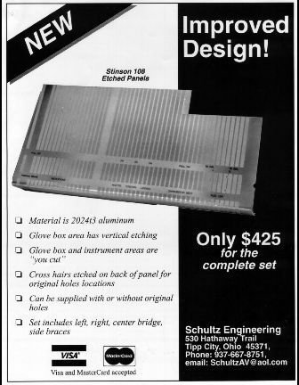 When I began the restoration of my Stinson, one goal was to return the plane to its original appearance. While I did not plan on a restoration that was exact right down to the Hallicrafter CA-2 Skyfone, the Stinson is a classic airplane, and I wanted to retain a classic look. That meant my instrument panel would need to appear nearly original, including those wonderful etched aluminum sections that serve as the lower portion of the instrument panel on the 108-1, -2, and -3. My panels, like most, were in poor shape. They had been cut, drilled, hammered, and abused. While Univair no longer has these panels in stock, they are now available from Dan Schultz of Schultz Engineering, as shown in his brochure below: The panels I received from Dan were outstanding in quality, with all holes drilled exactly where they should be. Markings are silk-screened. He can supply the panels with the correct marking for your fuel tanks depending on whether you have a 108-1, -2, or -3 (The 108-3 has larger fuel tanks.) It is necessary for you to cut the panels as needed for your radio installation. The space for the glove box door is also uncut in case you choose to install something else there. I cut mine on on the left, bending flanges for the radio stack, and on the right for the glove box. By the way, modern radios (6.25" wide) are a very tight fit on the left. There is just barely enough room between the left fuselage down tube and the left control column pulley. Be very careful about marking the panel for cutouts. Measure ten times and cut once. 108-3 Panel under construction In the above photo, I have completed the cutout for the radios and installed the trays (for an Apollo GX65 GPS/Com and a Narco transponder. ) I re-used the upper panel and the center main panel since they were in pretty good shape and will be hidden behind the false panel. The upper panel is riveted to the lower etched panels, along with a flange on either side that serves as the lower attach point for the false panel. On the right side, I have cut the panel for the glove box, attached the box from Univair, and added the glove box door. The glove box door that is shown above is a pretty good match. It was handmade. Instead of etched lines, the lines are painted. Dan Schultz now has the etched doors in stock, and sells them for $55, with knob, hinge, and catch. Glove box Door by Schultz Engineering In the photo above, the false panel is in place for a trial fit. It is still wearing the red paint from before the restoration, but will be stripped and re-painted in my favorite color, Stinson Maroon. Notice that the false panel covers the outboard instrument holes that were in my upper panel. Yokes were restored by Garry McCoy. I chose a gray finish to match the original and asked Garry to add a push-to-talk switch on the pilot's side only. In this photo, the false panel is off, the instruments are in place, and work has begun on the circuit breaker subpanels. As I said, I'm working on a "near-original" panel. Deviations will be the radios, circuit breakers, and an electric turn coordinator in place of the original turn and bank. The first two changes are for safety and convenience, the last because I just happen to have the turn coordinator. For those who are curious about the original panel, below is an image of the panel for the 108-3 as it appears in Owner's Operating Manual for the 1948 Stinson Flying Station Wagon and Stinson Voyager.
