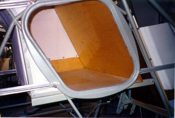 Baggage compartment on NC6197M. Birch ply is finished with clear Minwax polyurethane varnish. Stub wall on the pilot's side of the baggage compartment. Snaps came from the local five and dime. The final piece of wood on