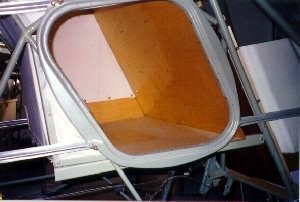 Another shot of the main rear flloorboard for 97M, this time from the top. This is the forward portion of the rear floorboard with the cabin vent installed. Bottom of the same piece. Flexible tubing will run from this vent to the firewall fitting. The rear floorboards on the Voyagers were not as elaborate. Barrie Bouwman of Rocky Mountain House, Alberta, Canada, has a 108 Voyager and reports that the originals are of 3/16" mahogany ply. He replaced his with baltic birch of similar dimensions. Since Barrie is in a cold climate, he also modifed the front floorboards in the area of the rudder pedals. To reduce drafts, he fabricated alumimum sheet fairings that are attached to the bottom of the floorboards around the rudder pedals. These fairings reduce the size of the openings but provide full travel of the pedals. He also plans to fabricate vinyl "boots" for the pedals, reducing drafts further. Barrie used foil backed helicopter insulation below his floorboards to help keep things warm. Woody Panels for the Flying Station Wagon. "Woody" panels consist of mahogany plywood with basswood overlays. Side panels on the 108-2 are flat. The side panels also have pine attachments on the sides to accept screws from the back panel. Rich Tweedie says the basswood was a real surprise. He thought it was birch until taking the old panels in to the local exotic wood emporium, where they told him they were basswood. Having never heard of basswood, Rich was amazed when purchasing it to find its extraordinary light weight. When finished with many coats of Minwax Oil, (sounds like a commercial) they indeed looked like beautiful hardwood overlays. Basswood shaves pounds off of the weight of the interior. I used Minwax polyurethane spray on all of the wood for 97M and it took many, many coats. Rich says the Minwax oil is wiped on, goes much quicker, and looks great. The rear panel for Rich Tweedie's