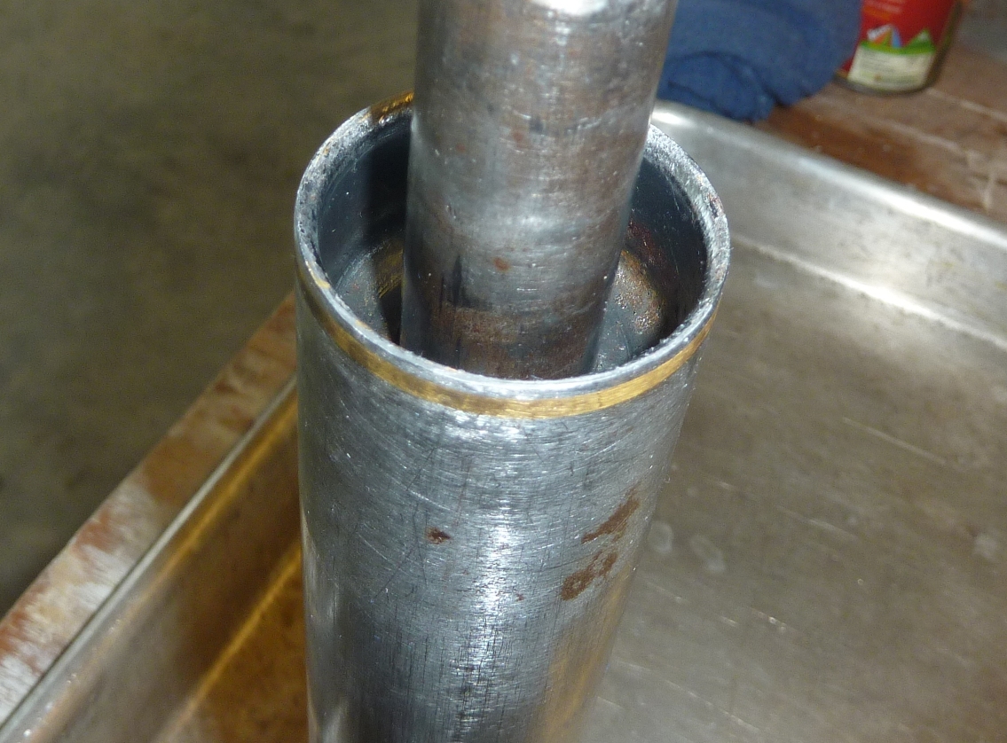 While we're talking about springs, you should know that it is important that the springs not be too short. New springs should be around 11 1/16" to 11 1/4" long. Aeronca owner Richard Jeffryes says, "When they get too short, they can rattle against the piston shaft and wear it, and they can also hammer the top of the oleo." Richard says he has seen spacers made, as well as taller packing glands. But the best bet (and the approved method) is simply to buy new springs. Another thought... it may be best to replace springs on both sides at the same time, as they do tend to get shorter over time. In 2013 I changed the spring on the "low" side on my Champ with a new one. You can guess the results - now the other side was "low." I immediately replaced the other side so things would be "on the level." Time to take things apart - removing the Oleo Piston Assembly