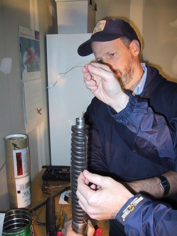 ![]() ![]() The Oleo Piston Assembly - the spring thing.... At the top of of the assembly there is an aluminum retainer (part number 1-316) that holds the spring in place. It is attached to the piston rod assembly (part number 1-2255) by a bushing (ASI-5028-1-22) that is driven though the retainer and through the piston rod. Once the assembly is back in the case frame, the AN-4-23A bolt that you removed earlier will go though the case frame, the retainer, the piston rod, and the bushing to hold the entire mess together. To remove the spring, you drive out the bushing. Use a punch or pin that is just under the diameter of the bushing, being careful not to damage the bushing, since you will reuse it. Once the bushing it driven out, the retainer can pop off and you can remove the spring. Assembly works just the reverse, after you installed the compressed spring as shown below. It works best if you take a file and create a slight taper on the edge of the bushing before reinstalling. We found that the piston rod wanted to slide back into the strut cylinder while we were installing the spring. To pull the piston rod back to it's fully extended length, we simply tied a piece of safety wire to the top where the retainer and bushing is attached, and used the safety wire to pull the piston rod to the extended position. Then we were able to easily slide the retainer onto the end of the rod. But before you put the new spring on, you need to replace the packing. The graphite packing keeps the hydraulic fluid from leaking from the lower hydraulic portion of the strut up into the upper spring portion of the strut. The packing sits in a small cup-like space called the stuffing box and surrounds the piston rod. It is held in place by a clever aluminum retainer called the packing gland, which is shaped so that it forces the packing against the piston rod. Pressure from the spring holds the packing gland in place. With the spring removed, it is easy to pry the packing gland off, exposing the packing and the stuffing box. The packing is like a thick, graphite coated piece of string, and is wrapped around the piston rod in the stuffing box. You'll need to cut the packing to fit. As received from Safe Air Repair, the packing was thicker than the packing I removed. You'll need one packing kit for each strut. The packing gland will sit high, but once everything is back together, it will compress and sit fine. Ideally, after things are back together, the gland should sit perhaps 1/8" or w little more proud of the stuffing box. If the packing gland rests against the face of the stuffing box, it cannot exert pressure on the packing and will leak. The photo on the left is of the aluminum packing gland, bottom side up. It sits on top of the hydraulic cylinder, held in place by the big spring. The beveled shape forces the packing against the piston rod to minimize seepage of the hydraulic fluid around the rod. In the second photo, the packing is partially installed in the stuffing box and Tom is using the knife to mark the packing for final cutting. David Rude says the new packings are not the same size as the originals and will wrap three turns instead of two as shown in the old drawings. My experience is that it depends on the supplier of the packing, or maybe even the particular batch. With some packings, it seems only possible to get one full wrap. John Propst has an excellent article on this topic on his website at this link. See more on packings below. ![]() ![]() ![]() In May of 2010, I received an email from John Price offering some additional information regarding the packing. First, he provided a PDF scan of an Aeronca Drawing 1-2119, Packing, Landing Gear Oleo Graphite, that provides details of the 3/8" packing installation. See it here. John notes that packing is "available from McMaster-Carr in 5, 10 and 25 foot lengths... 5 feet will cost you a whole lot less than 2 of what Univair or Wag-Aero will sell you... Is it legal to use it?... My take is yes, since 1-2119 specifies "Commercial Product Interchangeable with Johns Manville..."" Here's the link to the McMaster-Carr catalog: http://www.mcmaster.com/#compression-packing/=72krmj See more discussion and photos of packing in my 2013 update at the bottom of the page. Now you can fill the strut with oil. We chose to do this while the strut was on the bench. You could just as easily fill the strut after it is installed back on the airplane. Unscrew the plug, and fill with hydraulic oil. My 11AC Aeronca Manual says to fill with "Teleo" oil or any good hydraulic oil. We used standard MIL 5606 hydraulic fluid. Later, I learned that Carl White suggests using John Deere "Hy-GARD" multipurpose hydraulic fluid. He reports that the John Deere fluid is less messy, tends not to leak as much or leave a residue, and has the same specs as the "approved" Socony-Vacuum "Teleo" oil mentioned in the service manual. Aeronca owner George Edgerton has tried both MIL 5606 and the John Deere "Hy-GARD" and prefers the latter, reporting that "Bottom line is that the struts work extremely well with this oil---light years better than before." Others have suggested motorcycle fork oil. Dave Rude, who rebuilds oleos as a side business, says that he uses MIL 5606. He points out that the 7EC Manual specifies 5606 for the "no-bounce" oleo, and so he keeps a supply on hand and uses it for all of his struts. MIL 5606 is the "standard" and most A&P mechanics are comfortable sticking to that. You may notice some initial leaking after installing new packings. I experienced a bit of leaking at first, but it did not last. Richard Jeffreys reported, "My no-bounce gear did [leak] when I first installed them, but then the packing took a seat and they quit. A little oil looks like a lot." It's important that the strut is filled COMPLETELY with fluid. Lift the strut high enough so that it can be completely filled. An Aeronca Service Letter (#40, September 8, 1948) included the following information