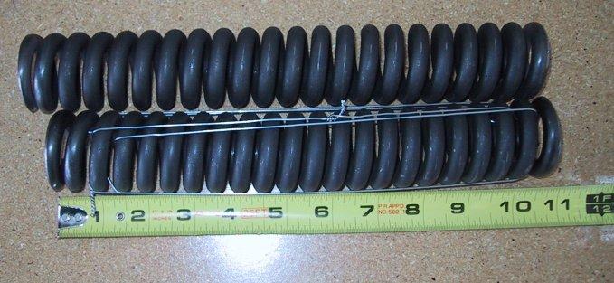 ![]() ![]() ![]() ![]() Here's another variation on the same theme, this arrangement by Dan Jones from Alberta, Canada. He actually used a combination of methods two and three. It helps to have a spare Continental W670 radial laying around the shop to use as "dead weight". Dan explains: " "The A frame trestle is 2x4's bolted together for stiffness and it's the absolute bare minimum height for a Champ, 87" from the apex of the saddle to it's base. You can't swing the gear leg out - I opted just to remove the case frame completely - my logic being that the lesser the angle I had to trestle the airplane at the less load I'd put on the other gear leg and it's packing. I jack the airplane with a small jack and then slip the trestle in place and lower the airplane down onto the free standing trestle. Then I use a heavy weight (I used a time-expired W670 Continental) tied down to the low wing's tie down point in case the trestle slips. It's all very easy to do solo." But before you lift that baby... Remember that we're working with springs here, and that can be tricky. You will need a way to compress the new spring so that you can install it on the strut. You may as well get ready for this before you start taking things apart. The new springs I received were 11 1/16" tall. To fit them on the strut you will need to compress them to about 10.5 inches. The method I used successfully was recommended by Aeroncateer Richard Jeffryes. It worked great. I went to my local hardware store and bought a half inch threaded rod, 2 feet long, with nuts and washers. I ran the rod through the new spring, with a nut and washer on each end. After tightening the nut so that the spring was compressed to about 10.5 inches, I used safety wire wrapped though the coils to hold the spring in the compressed state. Then I loosened the nuts and removed the threaded rod. Cool - I now had a shorter spring that I could fit onto the strut piston rod with no pain. The first photo below shows the spring compressed using the threaded rod. The second photo shows one spring "au natural" and the second held in the compressed state with safety wire. I used a safety wire in three different places around the circumference of the spring. For safety, it would be better to use double or triple wraps of safety wire, rather than the single wrap shown here. If a wire fails, it could cause injury. Also, when I've done this recently, I've used safety wire in FOUR places around the circumference. The old spring that I removed was 10.5" long, 9/16" shorter than the new spring. Richard Jeffryes has measured a couple of new springs and they were 11 1/8" tall. Richard Murray says the new springs he received from Wag Aero were 11 1/4" tall.
